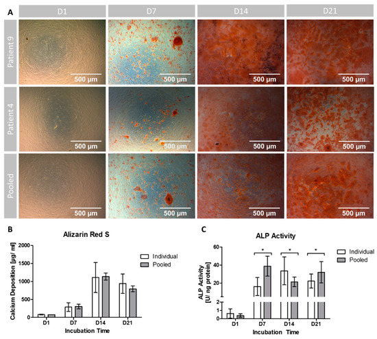 Evaluation of osteogenic differentiation. (A) Alizarin Red S stained extracellular calcium deposition of 2 representative patients (P4 and P9, respectively) and the pooled group over the cultivation period of 21 days. (B) Quantification of extracellular calcium deposition. (C) Quantification of ALP activity over the incubation period. (*) indicates significant differences. Individual: Data obtained from 10 patients (n = 2 technical replicates for each donor). Pooled: Data obtained from n = 10 replicates.