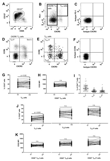 Blood T follicular helper (TFH) cells can be identified by surface expression of CXCR5 and PD-1 [20,53]. The PD-1+CXCR5+ (TFH) cells were gated on CD127+ cells to exclude contamination from TReg cells (Figure 4B) and comprised 3.1% (IQR: 2.0–3.8%) of CD4+ T cells. Carriers of the risk genotype (TT) had a suggestively lower frequency of CD25+ TFH cells (p = 0.02) compared to carriers of the protective genotype (CC) (Figure 4G). Differential surface expression of chemokine receptors CXCR3 and CCR6 separates TFH1 (CCR6−CXCR3+), TFH2 (CCR6−CXCR3−), and TFH17 (CCR6+CXCR3−) cells [54] (Figure 4E). TFH1 cells made up the largest group of TFH cells (Figure 4I) and we found that carriers of the risk genotype had a significantly lower frequency of CD25+ TFH1 cells (p = 0.001) while we observed no IL2RA genotype associations on the TFH2 and TFH17 cells (Figure 4J). We observed no IL2RA genotype associations with surface expression levels of CD25 on the CD25+ TFH subsets (Figure 4K).