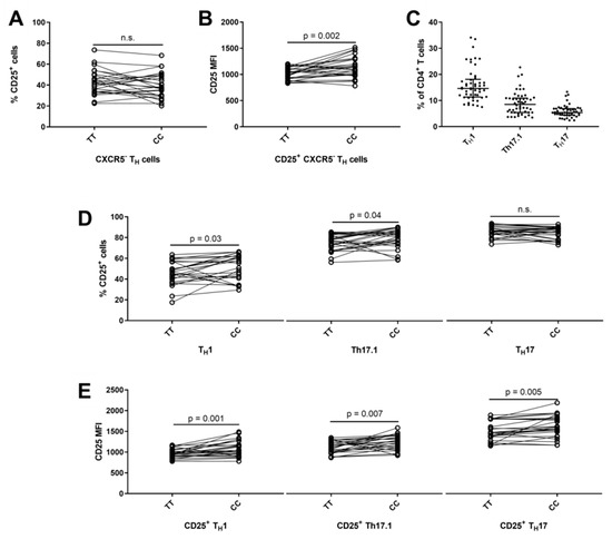 Non-follicular helper T (TH) cells, defined as CXCR5− and CD127+ (Figure 4B), comprised 80% (IQR: 77–82%) of CD4+ T cells. We observed that carriers of the risk genotype had a significantly lower surface expression of CD25 (p = 0.002) on CD4+ CD25+ CXCR5− TH cells (Figure 5B). Chemokine receptors CXCR3 and CCR6 can distinguish lineage commitment of CXCR5− TH cells and defines three subsets: TH1 (CCR6−CXCR3+) [55]; Th17.1 (CCR6+CXCR3+) [56,57] and TH17 (CCR6+CXCR3−) [56,58] (Figure 4D). Distribution of the three CXCR5− TH subsets can be seen in Figure 5C. Carriers of the risk genotype (TT) had a suggestively lower frequency of CD25+ Th17.1 cells (p = 0.04) and CD25+ TH1 cells (p = 0.03) compared to the protective genotype (Figure 5D). In addition, carriers of the risk genotype (TT) had a significant decrease in surface expression of CD25 on CD25+ TH1 (p = 0.001) and CD25+ TH17 cells (p = 0.005) and a suggestively lower surface expression of CD25 on CD25+ Th17.1 (p = 0.007) cells compared to carriers of the protective genotype (CC) (Figure 5E).