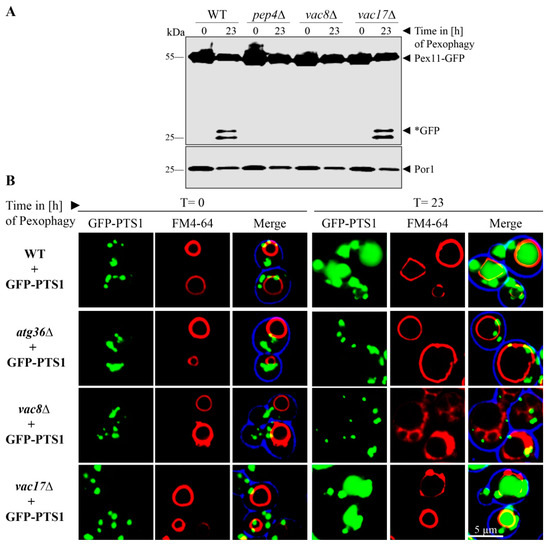 Peroxisomes are essential for growth in oleate medium, and therefore their proliferation is induced under these conditions [,,]. As the second step, the cells were shifted to glucose-containing medium, which lacks oleate and contains a reduced amount of nitrogen sources in order to induce the degradation of the not needed excess of peroxisomes. We found that the peroxisomes marked with Pex11-GFP were degraded in the vacuoles of WT cells (Figure 3A). While Pex11 is hydrolyzed together with the rest of the peroxisome, the GFP-fusion-tag remains relatively stable within the vacuole. Therefore, the occurrence of free *GFP is regarded as a marker for functional pexophagy. In contrast, the deletion of the protease Pep4 served as negative control, because no free *GFP is generated.