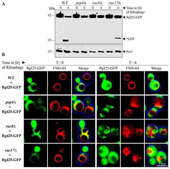 Based on our finding that Vac8 is required for the bulk autophagy of the cytosolic protein Pgk1-GFP and essential for the selective autophagic degradation of peroxisomes via pexophagy, we tested the role of Vac8 in the autophagic breakdown of ribosomes. The ribosomal protein of the large subunit Rpl25 (ribosomal protein large 25) was fused to GFP in order to analyze the ribophagy of the 60S subunit (Figure 4A). At the end of the ribophagy assay (t = 6 h), free *GFP was generated in WT and vac17Δ cells. In contrast, the vac8Δ cells show no *GFP, like the negative control pep4Δ.