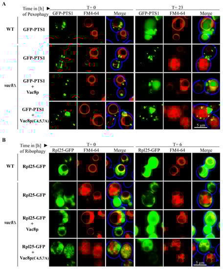 The plasmid Pgk1-GFP was a kind gift by Prof. Michael Thumm (Universität Göttingen, GER) []. The Pep4-GFP plasmid was provided by Prof. David Goldfarb (University of Rochester, NY, USA) []. Rpl25-GFP was ordered from Prof. Michael Rout (Rockefeller University, New York City, NY, USA) via Addgene (Addgene plasmid #24037). The integrating Vac8 and Vac8(C4/5/7A) plasmids were obtained from Prof. Christian Ungermann (Universität Osnabrück, GER) [].
