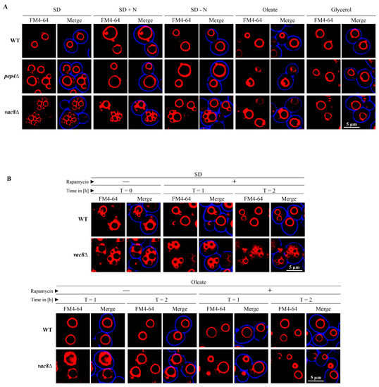 Glucose-grown (SD medium) vac8Δ cells display the typical fragmented vacuolar phenotype (Figure 6A), which is caused by a vacuolar fusion defect []. When we shifted the SD-grown cells to a medium with additional nitrogen sources (SD + N) or reduced nitrogen sources (SD − N), the appearance of the vacuolar structures in vac8Δ cells changes to certain extent. Nearly no change can be seen in cells growing in SD + N medium, while cells in SD − N medium, a starvation medium, show one slightly more enlarged central vacuole associated with several smaller vacuolar structures.