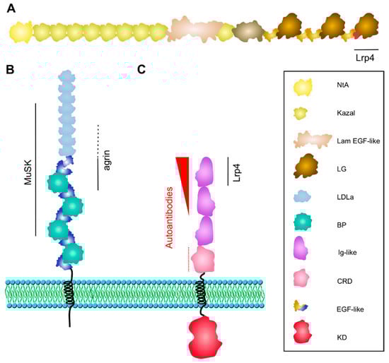 Lrp4 is expressed in multiple tissues in the mouse, and is therefore important for the proper development and morphogenesis of different organs such as limbs, lungs, and kidneys [127]. Lrp4 is a single-pass transmembrane protein with a large extracellular domain that contains eight low-density lipoprotein receptor domain class A (LDLa) repeats, two EGF-like domains, and four β-propeller (BP) domains, each of which is fused together with an EGF-like domain (Figure 2B). Neuronal Agrin binds predominantly to the first BP domain, although the last few LDLa repeats contribute to Agrin-binding [128]. The crystal structure of the Agrin-Lrp4 complex showed that the central part of BP1 represents a six-bladed β-propeller domain (conserved in the LDLR family) with two slightly concave surfaces perpendicular to the β-propeller’s central axis [125]. One surface is enclosed by the two flanking EGF-like domains, the second surface is involved in Agrin binding via the B/Z loop (as described above). Crystal structures of close relatives of Lrp4 such as Lrp6 demonstrated the use of the same surface for ligand binding. The Agrin–Lrp4 dimers further assemble into a tetrameric complex via interfaces between Agrin and Lrp4 (no Lrp4 dimers were observed), which is required for MuSK activation. The third BP domain as well as the fourth and fifth LDLa repeats are critical for binding of Lrp4 to MuSK (via the first Ig-like domain, described below) [128]. The transmembrane and intracellular domains are not required for MuSK activation by Agrin.