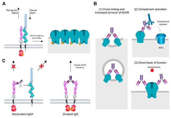 Pathogenic mechanisms of MG autoantibodies at the NMJ. (A) At the healthy NMJ, neural Agrin stimulation induces interaction between Lrp4 and MuSK, leading to MuSK autophosphorylation and activation and the phosphorylation and clustering of AChRs. A retrograde signal for presynaptic development is sent via Lrp4. (B) MG antibodies of IgG1 and IgG3 subclass against AChR have three pathogenic mechanisms: (1) Cross-linking and increased turnover of AChR lead to reduced AChR levels at the NMJ, (2) activation of the classical complement cascade, formation of the membrane attack complex (MAC) and complement-mediated damage of the postsynaptic membrane, and (3) direct block of function by preventing the binding of acetylcholine. (C) Bispecific IgG4 antibodies of IgG4 subclass against MuSK bind monovalently to MuSK and block Lrp4-MuSK interaction, thus interrupting the agrin-Lrp4-MuSK-Dok7 signaling axis and causing reduced densities of AChR at the synapse. A further effect is the disruption of a retrograde signal from Lrp4 to the motor neuron. Divalent binding of MuSK IgG leads to dimerization, autophosphorylation, and activation of MuSK independent of Agrin stimulation and causes the formation of ectopic AChR clusters. Created with BioRender.