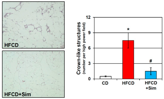 Representative histology of mesenteric adipose tissue of conditional KrasG12D mice fed an obesogenic high fat high calorie diet (HFCD) for 3 months supplemented without (upper panel) or with simvastatin (sim; lower panel). Quantification of crown-like structures demonstrates significant elevation of adipose tissue inflammation in obese HFCD-fed mice, which was abrogated by simvastatin (sim). *: p < 0.01 vs. CD; #: p < 0.01 vs. HFCD