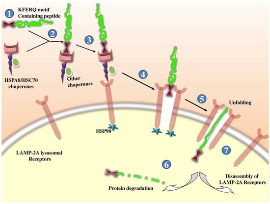 In chaperone-mediated autophagy (CMA), (1) KFERQ motif that is present in 30% of soluble cytosolic proteins (2) is recognized by cytosolic chaperone protein HSPA8/HSC70, which is present in a complex with other chaperone proteins. (3) Such recognized proteins bound to lysosomal receptor protein LAMP-2A. (4) Binding of the substrate with the LAMP-2A leads to oligomerization of receptors. (5) With the help of HSP90, the substrate is then unfolded and translocated through LAMP-2A-enriched translocation complex. (6) After reaching inside the lysosomes, the proteins are degraded (7), and the LAMP-2A receptors are disassembled.