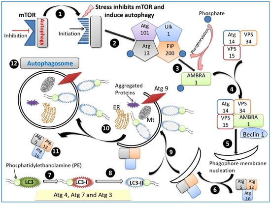 Process of autophagosome formation. (1) Autophagy is inhibited by mTOR. (2) Various kinds of stress (hypoxia, oxidative stress, pathogen infection, endoplasmic reticulum stress or nutrient starvation conditions) inhibit mTOR, and the process of autophagy is initiated. (3) Assembly of ULK complex occurs, and the complex includes ULK-1, autophagy-related protein 13 (Atg13), Atg101 and FAK-Family Interacting Protein (FIP200). (4) The complex phosphorylates AMBRA1. (5) AMBRA1 activates PI3K complex encompassing Atg15, vacuolar protein sorting 15 (VPS15), VPS34, Beclin-1 and AMBRA1 which helps in nucleation. (6) Atg5-Atg12-Atg16 complex is recruited to phagophore and prevent premature fusion of vesicle to the lysosome. (7) LC3 is conjugated with PE by the ubiquitin-like system and (8) transformed into LC3-II with the help of Atg4, Atg7, and Atg3. (9) LC3-II is present on both the inner and outer surfaces of the autophagosome. (10) Atg 9 further elongates the membrane and forms intraluminal vesicles; also required for local acidification. (11) Atg5-Atg12-Atg16 complex is dissociated from the complete autophagosome (12).