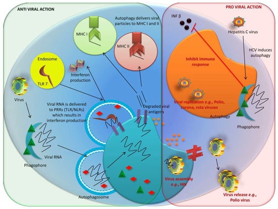 Autophagy has a beneficial role in cellular defense against invasion by viruses; therefore, it has been used for antiviral immunity [141,233,234]. Autophagy helps to clear viral pathogens during infection via various molecular mechanisms, regulates immune responses, and prevents harmful overactivation and inflammation [235]. For example, autophagy increases the presentation of endogenous viral antigens in the peptide grooves of major histocompatibility complex (MHC) class I molecules on the cell surface during herpes simplex virus type 1 (HSV-1) infection. Studies of viral peptides have suggested a complex interaction between vacuoles and MHC class I presentation pathways in autophagosomes [236]. In contrast, MHC class II molecules continuously accept input from autophagosomes, which facilitates antigen presentation by MHC class II molecules [237,238]. Autophagy is a major component of Drosophila immunity against vesicular stomatitis virus (VSV) [239] as it can deliver viral antigens to TLRs for presentation. During anti-viral signaling, pattern recognition receptors (PRRs) at the plasma membrane (i.e., Toll-7) that are engaged by VSV stimulate an autophagy-dependent innate immune response mediated by PI3K-Akt-signaling [239,240]. Furthermore, Toll/TLR signaling has been shown to regulate the Rift Valley fever virus (RVFV) replication in both flies and mammals [241], whilst SIRT1, an NAD(+)-dependent deacetylase, modulates the activation of dendritic cells and autophagy during induced immune responses against respiratory syncytial virus (RSV) [242], thereby directing an effective anti-viral immune response. Furthermore, autophagy is stimulated by the salicylamide derivatives against cytopathic bovine viral diarrhea virus (cp-BVDV), a Flaviviridae pestivirus [243]. Foot-and-mouth disease virus (FMDV) infection suppresses autophagy and NF-κB anti-viral activities by degrading Atg5-Atg12 using the viral protein, 3Cpro, suggesting that Atg5-Atg12 positively modulates anti-viral NF-κB and IRF3 pathways during FMDV infection to limit FMDV proliferation [244]. However, autophagy is often hijacked by viral pathogens and can be modulated to their own benefit.