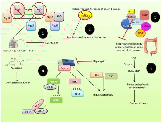 Initially, autophagy was thought to be involved in tumor suppression by stimulating gene expression, inhibiting proinflammatory mediators, inhibiting inflammation or inflammatory products, and stimulating signaling pathways. The essential Atg6/Beclin 1 gene was found to be lost monoallelically in 40–75 % of human prostate, breast, and ovarian cancers [285], whereas excessive autophagy stimulation by Beclin 1 overexpression has been reported to inhibit tumor progression [286,287]. Autophagy causes necrosis and chronic inflammation by inhibiting the release of pro-inflammatory HMGB1, which is involved in tumorigenesis [288]. In cell-based assays, inhibiting autophagy was shown to enhance cancer cell growth [289]. p62 (a signaling adaptor/scaffold protein) is involved in the formation of intracellular ubiquitin-related protein aggregates because of autophagy deficiency. Atg7-deficient mice exhibit enhanced accumulation of p62 and ubiquitinated protein aggregates in hepatocytes and neuron [290]. Autophagy has also been implicated in benign hepatomas [291], and the inactivation of Beclin 1 and Atg5 was shown to increase the incidence of cancer in mice [292]. Atg5- and Atg7-deficient mice exhibited liver tumors, indicating that defective autophagy can affect the suppression of tumorigenesis [292]. Heterozygous Beclin 1 (beclin 1+/- mutant) was shown to have a high incidence of spontaneous tumors [289,293], whilst Beclin 1 inhibited tumor growth in cell lines such as the breast cancer cell line, MCF-7, in which Beclin 1 expression was lower than in normal epithelial breast cells [294]. The UVRAG protein was found to suppress the tumorigenicity and proliferation of human colonic cancer cells [295] (Figure 6).