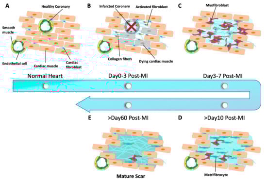 During the development of coronary artery diseases, such as myocardial infarction (MI), the heart tissue undergoes a pathological remodeling where necrotic myocardium is replaced by non-myocyte cells to preserve functional and structural integrity of the heart. Remodeling is characterized by excessive accumulation of collagen-based extracellular matrix (ECM) majorly from resident cardiac fibroblasts [27]. Previous studies [28,29] have suggested that fibroblasts constitute the majority of non-myocytes in the heart, which was considered recently to be overestimated in the adult murine and healthy human heart [30]. In the normal healthy heart (Figure 1A), cardiac fibroblasts remain quiescent and play an essential role in the maintenance of mechanical, structural, and electrophysiological functions of the heart [31,32]. However, in an infarcted myocardium, quiescent fibroblasts are activated to secrete various pro-inflammatory factors [33] and quickly re-enter the cell cycle (Figure 1B). Following a massive proliferation, cardiac fibroblasts differentiate into contractile myofibroblasts that are characterized by the expression of α-smooth muscle actin (αSMA) within a week of a MI [33,34,35] (Figure 1C). Toward the end of remodeling, myofibroblasts exit the cell-cycle and provide a stronger contractile support to the damaged heart by secreting much more ECM than fibroblasts [36,37,38]. In most tissues, myofibroblasts undergo apoptosis when the scar is fully matured and the healing process is completed [39,40]. However, in the heart, a significant number of quiescent myofibroblasts persist in the formed mature scar for long time (>60 days post-MI) to mechanically support and protect the heart against any further damage [41]. Very recently, Fu et al. identified a more specialized type of cell, termed matrifibrocytes, with expression of new marker genes, such as bone-cartilage markers Chad and Comp. They found that matrifibrocytes were further differentiated from myofibroblasts and persisted in the chronic myocardial scar [42] (Figure 1D). Their lineage-tracing studies has updated our understanding of the pathological remodeling in an infarcted heart. In brief (Figure 1), quiescent cardiac fibroblasts are activated upon injury and reach a maximum proliferation rate within Day 2–4 post-MI, followed by αSMA+ myofibroblast differentiation and proliferation by Day 3–7 post-MI; from Day 10 post-MI, myofibroblasts lose proliferative ability and αSMA expression and then further differentiate into matrifibrocytes and finally form a mature scar within 60 days [39]. However, the role of matrifibrocytes in heart remodeling and regeneration has yet to be understood.