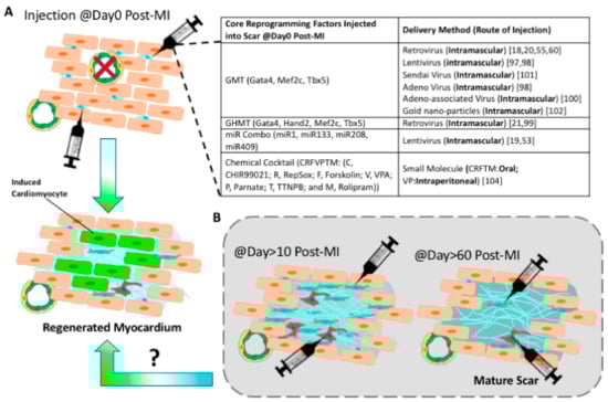 Progresses and challenges of in vivo reprogramming. (A) Cardiac reprogramming factors were all delivered right after acute myocardial infarction. The inserted table summarizes in vivo reprogramming studies that use various viral or chemical cocktails [18,19,20,21,53,55,60,97,98,99,100,101,102,104]. (B) It is unknown if a cardiac chronic scar can be reprogrammed into induced cardiac muscle tissue.