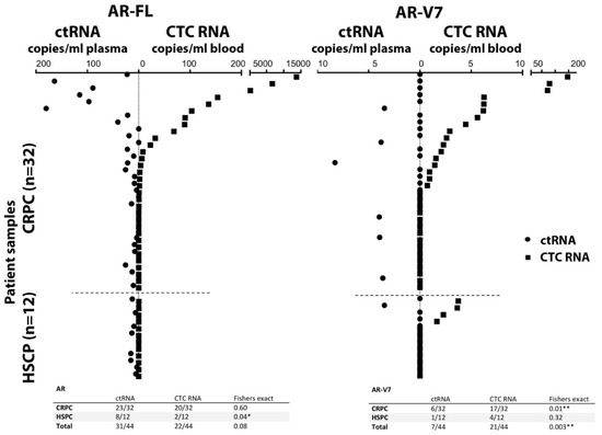 Detection of AR-FL (left) and AR-V7 (right) transcripts. Comparison of AR-FL and AR-V7 detection in CTC RNA and ctRNA from the same blood draw illustrated by mirrored scatter blot for the 44 patient samples (sorted in relation to detection in CTCs); summarized data are tabled below. *, ** indicate significance p-value ≤ 0.5 and ≤ 0.01, respectively.