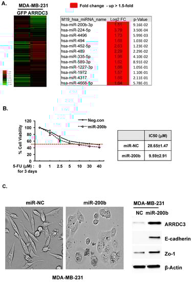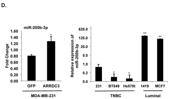 14], we explored the relationship between ARRDC3 and specific miRNAs important in controlling invasive and chemo-resistant potentials of TNBC. miRNA array based screening and subsequent functional analysis of target miRNAs whose expression are regulated by ARRDC3 expression in TNBC cells led to the finding that miR-200b-3p (miR-200b) is an important target gene of ARRDC3 in mediating its metastatic suppressing and chemo-sensitizing functions. While the role of miR-200b in chemo-sensitization and tumor suppressing functions in hepatocellular carcinoma and glioma models has been demonstrated [
