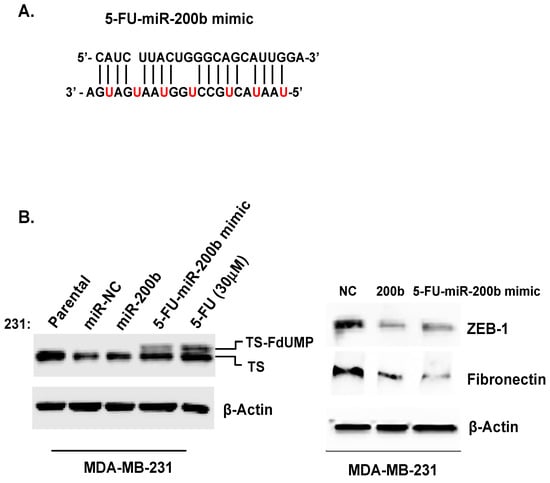 Figure 4). This clearly demonstrated that 5-FU released from the intact 5-FU-miR-200b will be able to function as a therapeutic 5-FU molecule, and it will be incorporated in to RNA/DNA to influence RNA or DNA synthesis. It is interesting to note that 5-FU-miR-200b mimic seems to possess broader specificity of inhibiting breast cancer subtypes than wild type miR-200b. miR-200b is mainly effective in inhibiting proliferation of TNBC cell line, but not luminal breast cancer cell line whereas 5-FU-miR-200b mimic is effective in inhibiting proliferation of both cell lines (