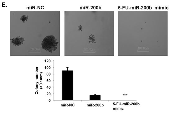MDA-MB-231 cells transfected with control (NC), miR-200b and 5-Fu_miR200b were suspended in the top layer of DMEM (1 mL) containing 0.35% low-melt agarose (ISC Bioexpress, Kaysville, UT, USA) and then the top layer was overlaid on DMEM (2 mL) containing 0.75% agar in six-well plates. The cells were fed twice per week with 0.5 mL DMEM. After 3 weeks, colonies larger than 0.1 mm in diameter were counted per well by using bright-field optics. The images of colonies were assessed by a microscope and digital camera (Nikon). The average number of colonies was obtained from counting triplicate wells.