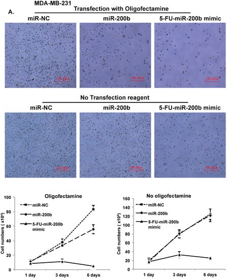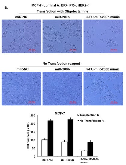 Figure 5). This outcome suggests that 5-FU-miR-200b mimic can be further characterized as pan-breast cancer therapeutic agent including TNBC. The mechanism by which 5-FU-miR-489 mimic enters into the cells without transfection reagent is not defined yet. However, there are multiple evidence supporting that chemical modifications of oligonucleotides confer their ability to get into the cells without transfection agents (called “gymnosis”) [