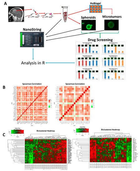 Microtumors (5–6 per group) and spheroids were tested for anti-tumor activity profiles of 6 selected drugs (Table 2) using EC25 or EC50 treatment doses (0–10 μM range) based on literature [28,29,30,31,32]. Cell proliferation activity of microtumors and spheroids were determined with CellTiter-Glo assay kit during the optimized 1 to 14 day culture period. Figure 1 shows the graphical outline for the cultivation of PDX, microtumors, and spheroids and parallel drug screening and NanoString assay. Drug response was measured at day 7 and day 14 following treatment. Results of drug screening are in Supplementary File 1.