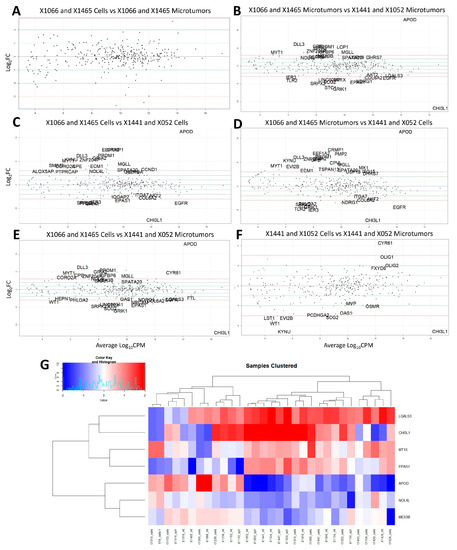 Differential expression of TMZ response concordant (X1066 and X1465) and discordant (X1441 and X1052) tumors: (A) X1066 and X1465 Cells vs X1066 and X1465 Microtumors; (B) X1066 and X1465 Microtumors vs X1441 and X1052 Microtumors; (C) X1066 and X1465 Cells vs X1441 and X052 Cells; (D) X1066 and X1465 microtumors vs X1441 and X1052 Cells; (E) X1066 and X1465 Cells vs X1441 and X1052 microtumors; (F) X1441 and X1052 Cells vs X1441 and X052 Microtumors; (G) Seven gene signature from differential expression of concordant microtumors vs discordant microtumors of genes associated with TMZ response. Samples clustered by TMZ response concordance (left) and discordance (right). Significance determined by: p ≤ 0.05 and −2 ≥ log2 Fold Change ≥ 2. Log10CPM = Log base 10 of counts per million.