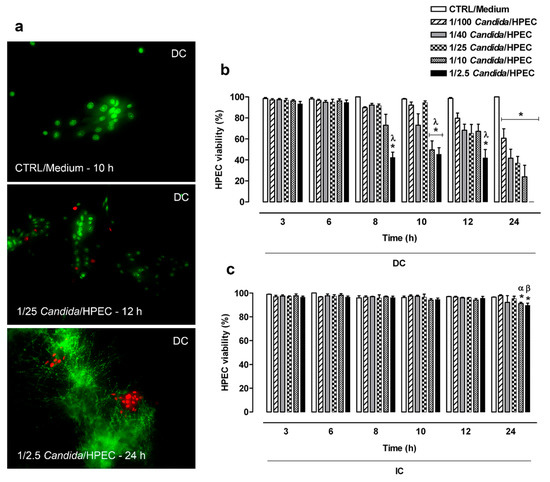 Human palate epithelial cell (HPEC) viability after direct contact (DC) with different Candida albicans/HPEC ratios (1/100 to 1/2.5) over time (3–24 h). (a) Representative fluorescence images of viable HPECs stained with calcein (green fluorescence, living cells) after direct contact with Candida cells and non-viable HPECs with ethidium bromide linked to DNA (red fluorescence nuclei, dead cells). * Fungus in filamentous form. HPECs cultured in medium (cells unchallenged) served as a control (CTRL/Medium). LIVE/DEAD staining (fluorescence microscope, ×200 magnification). (b,c) The number of living cells expressed as percentage of the total cell number was used to establish the quantitative cell viability index. Comparative analysis among different fungal ratios after DC or indirect contact (IC) over time. (*) p < 0.05 compared to the medium at the same time. (λ) p < 0.016 compared to 3 and 6 h. (α) p < 0.03 compared to 3, 6, and 8 h. (β) p < 0.05 compared to all other times. Results are expressed as the mean ± standard error of the mean (SEM) of at least three independent experiments performed in triplicate with the factorial ANOVA contrast test.