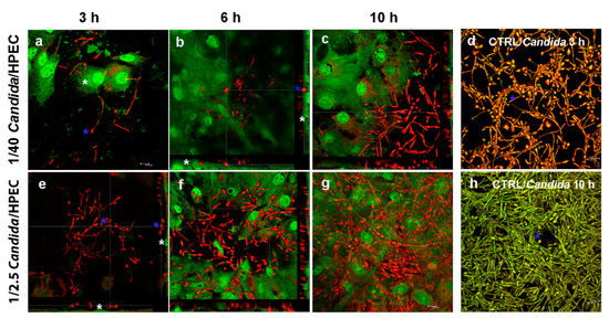 The C. albicans - human palate epithelial cell (HPEC) invasion process after direct contact (DC) with different ratios of Candida/HPEC. (a,e) Filamentous fungus (blue asterisk) at the periphery of epithelial colonies; filaments positioned on the epithelial cells (white asterisk) without epithelial invasion. (b) Initial intraepithelial invasion (active epithelial penetration) by the fungus (blue asterisk). HPECs are stained in green (white asterisk). (c,f,g) Intensified intraepithelial invasion due to the increased C. albicans concentration and density of prolific filamentous forms over time. (d,h) The fungal biofilm (blue asterisk) in the absence of epithelial cells (CTRL/Candida) that is qualitatively more intense than the one in the presence of HPECs. Acridine orange staining (confocal laser-scanning microscopy, 630× magnification).