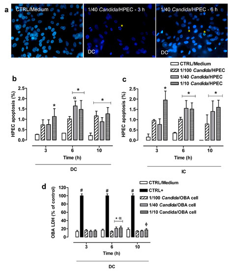 Cytotoxic effects induced in human palate epithelial cells (HPECs) by different C. albicans ratios over time. (a) HPECs underwent typical morphological apoptosis after direct contact (DC) with C. albicans. The DNA-binding dye showed nuclear chromatin morphological features as a quantitative apoptosis index within the cell culture system. * Apoptotic bodies. Hoechst 33,258 staining (fluorescence microscope, ×400 magnification). (b,c) HPEC apoptosis analysis between different fungal ratios after DC or indirect contact (IC) with C. albicans over time. (d) Cytotoxic effects were measured by lactate dehydrogenase (LDH) enzymatic activity in cells of the immortalized human gingival epithelial cell line OBA-9 after DC with the fungus (*) p < 0.02 compared to unchallenged cells (CTRL/Medium) at the same time. (#) p < 0.001 compared to all Candida/OBA cell ratios at the same time. (α) p < 0.04 compared to all other times. (φ) p < 0.03 compared to 1/100 Candida/OBA cells at 10 h. Results are expressed as the mean ± SEM of at least three independent experiments performed in triplicate with the factorial ANOVA contrast test.