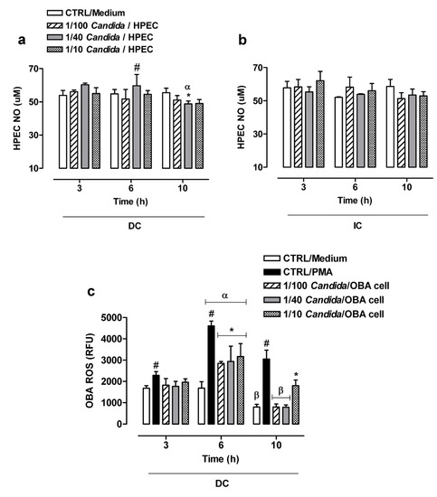 The NO production by HPECs in IC with the fungus remained at similar levels from 3 to 10 h for all Candida/HPEC proportions. An increase in the fungus concentration did not change the HPEC NO production profile, which was similar to that of the CTRL/Medium (Figure 4b). The NO production was found to be similar between DC and IC when considering the same time period and each individual fungal proportion. Unlike the HPEC NO production, the OBA-9 cells did not show either a basal NO concentration or NO production after challenge with the fungus.