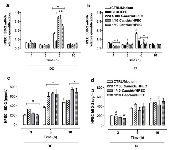 Significant β-defensin 2 (hBD-2) expression by human palate epithelial cells (HPECs) was induced by C. albicans infection. (a,b) Regulation of hBD-2 mRNA expression in HPECs after direct (DC) or indirect contact (IC) with C. albicans in different ratios over time. The mRNA levels were quantified by RT-qPCR using gene expression assays and normalized with β-globulin as the reference gene. (c,d) hBD-2 secretion by HPECs after DC and IC with C. albicans over time. (*) p < 0.007 compared to unchallenged cells (CTRL/Medium) at the same time. (#) p < 0.047 compared to CTRL/LPS at the same time. (α) p < 0.026 compared to all other times. (β) p < 0.001 compared to 1 h. (γ) p < 0.005 compared to 3 h. Results are expressed as the mean ± SEM of at least three independent experiments performed in triplicate with the factorial ANOVA contrast test.