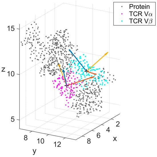 Schematic representation of TCR Vα (magenta) and TCR Vβ (cyan) with local eigenvectors. The remaining parts of the complex (labelled Protein) are shown in gray. Eigenvectors (v1, v2, v3 and w1, w2, w3) are displayed for a single frame of the trajectory and colored blue (v1, w1), orange (v2, w2) and yellow (v3, w3). Units of the coordinate axes are in nm.