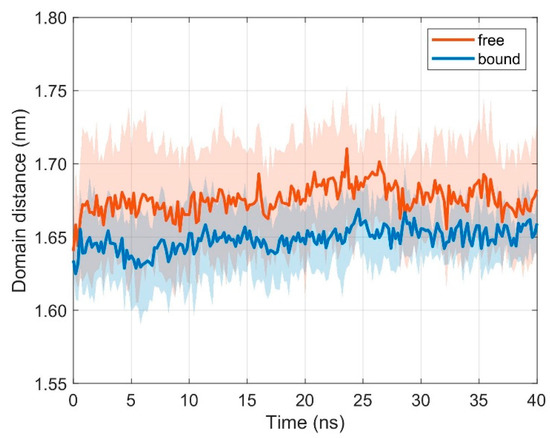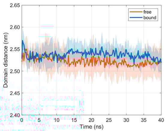 One commonly used method among many others [26,27,28] to characterize relative movements of intramolecular domains is the calculation of distances between groups of atoms (domains) as a function of simulation time. We evaluated the distances d between the geometric centers of domains, based on the Cα atoms in the protein backbone.