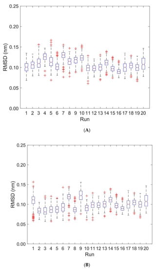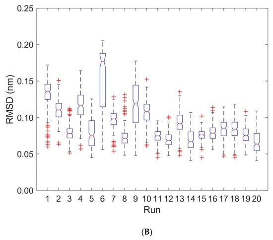Boxplots of RMSD for TCR Vα and TCR Vβ. RMSD-values are computed for every 0.2 ns with respect to the first frame of each trajectory. Run numbers 1 to 10 correspond to unbound states, 11 to 20 to bound states. (A) RMSD for TCR Vα domain. (B) RMSD for TCR Vβ domain.