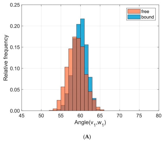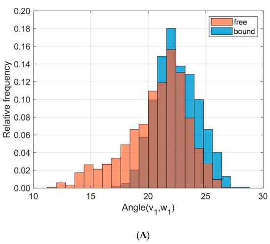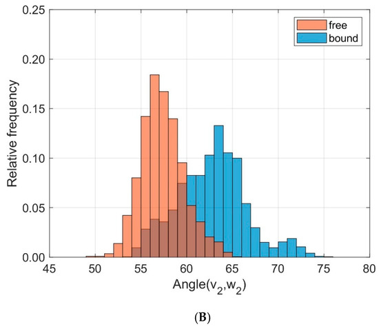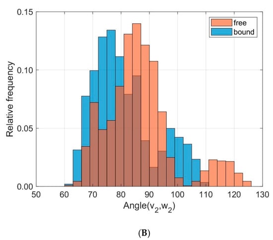 Frequency distribution of angles between corresponding principal component eigenvectors of domains MHC α1 and MHC α2 for bound (blue) and unbound states (orange). (A): Angles between eigenvectors v1, w1 corresponding to the main extensions (D = 0.255); (B): Angles between v2, w2 (D = 0.290).