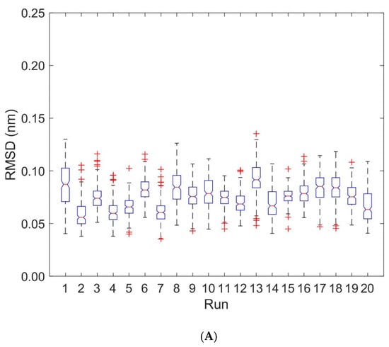 where T is the time interval over which the average is taken and tj is the time of frame j during the simulation of the respective trajectory. Here, we have chosen the time-averaged position of atom i as the reference position, i.e., riref = <ri>. Whereas the RMSD(t) is an average taken over all atoms within a group for a specific time t, the RMSF(i) is an average over time for a specific atom i.