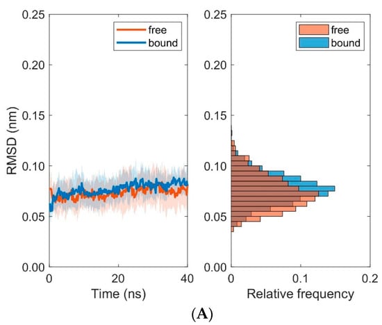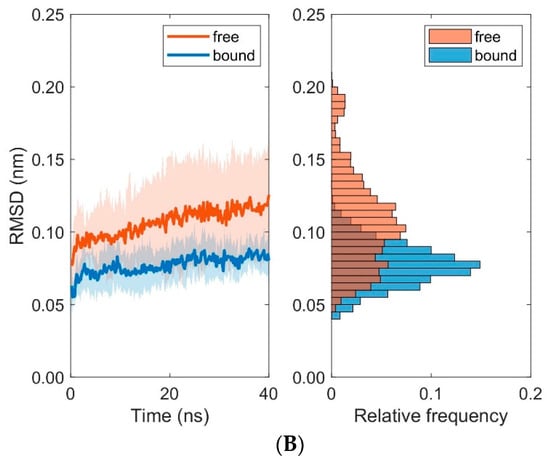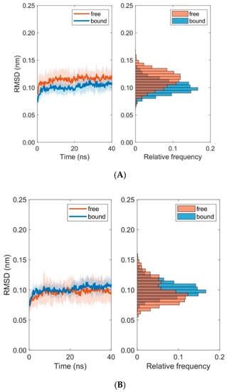 Time course and distribution of RMSD-values for domains TCR Vα (A) and TCR Vβ (B). Time-series (left panels, mean ± SD) and histograms (right panels) display pooled RMSD-values from ten 40 ns MD simulations each for bound and unbound (free) states.