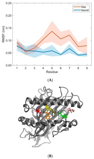 Further examination of domain RMSD-values revealed that MHC α2-dynamics clearly depends on the binding states (i.e., bound versus unbound) of TCR and pMHC molecules, see Figure 9. Conformational flexibility, as characterized by the RMSD-values of MHC α2, was distinctively larger in the unbound states as compared to the bound states. On the contrary, differences between bound and unbound states in RMSD-values of the TCR domains Vα and Vβ were considerably less pronounced, see Figure 10. The decrease of domain RMSD-values of MHC α2 is consistent with the dynamics of the peptide placed in the binding groove between the two MHC α-helices: Root mean square fluctuations (RMSF) of individual residues of the peptide during the course of the simulations show distinctively larger values in the unbound as compared to the bound states (Figure 11). In particular, central amino acid residues at positions 4–7 within the peptide (Leu, Gln, Ala, Phe) display reduced dynamic flexibility upon binding of the pMHC with the TCR, in agreement with previous studies of various peptide/MHC-I complexes and TCRs [35,36], see [6,37,38,39] for reviews. On the other hand, the N- and C-termini of positions 1 and 9 in the peptide are much less influenced by TCR-binding due to the network of hydrogen bonds from the β-sheet and from the lateral α-helices which stabilize the peptide binding domain [12]. Macdonald et al. [18] emphasized the importance of the C-terminal region (p6–p8) of the peptide for TCR recognition: In particular, the small p6 (Ala) and p8 (Thr) residues enabled the aromatic p7 (Phe) residue to protrude within a central pocket of the TCR, sandwiched between Tyr31α and Tyr100β; the p6-Ala made interactions with the CDR3α and the CDR3β loop, while p8-Thr and p7-Phe formed contacts with the CDR3β loop.