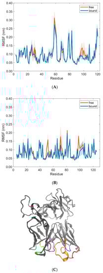 Residues in the variable domains Vα and Vβ of the T-cell receptor show less pronounced differences in RMSF-values between free and bound states, with the exception of residues 30 (Thr), 31 (Tyr), 58 (Arg), 96–98 (Gly, Gly, Thr), 100 (Tyr), and 102 (Gly) in the TCR Vα domain and residues 50–52 (Gln, Asn, Glu), 71–73 (Glu, Gly, Ser), 98–100 (Gln, Ala, Tyr), and 105 (Glu) in the TCR Vβ domain (Figure 12). Apart from residue 58 in the Vα domain and residues 71–73 in the Vβ domain, all the other residues with a distinctively larger RMSF-value in the unbound states are part of the CDR-loops CDR1α (30, 31), CDR3α (96–98, 100, 102), CDR2β (50–52), and CDR3β (98–100, 105). These results are in agreement with several studies that have found a reduced mobility of the TCR [6,40] and conformational changes in the CDR-loops [4,7,41] upon formation of the TCR-pMHC complex. In particular, we observed a structural change between the free and bound states in the CDR3α loop of residues 95–97 (Ala, Gly, Gly) from a 310-helix (free) to a coil (bound), where Gly96α and Gly97α form interactions with Arg62 and Ile66 of the MHC α1 helix, respectively [18] (see supplementary Figure S1). As to the type of interactions between CDR-loops and pMHC, Macdonald et al. [18] reported predominantly van der Waals interactions and H-bonds, including one salt bridge between Glu52β of CDRβ2 and Arg79 of the α1 helix. These crystallographic studies have also shown that CDR1α and CDR2α loops make contacts with the α2 helix of pMHC, whereas contacts to the α1 helix are established by the CDR2β and CDR3α loops (CDR3α also makes interactions with the α2 helix and the peptide). While the CDR1β loop participates only minimally in the TCR-pMHC interactions, the contacts with the peptide are dominated by the CDR3β loop, which sits centrally above the peptide-binding cleft, adjoining the CDR3α loop (see also Figure 12C).
