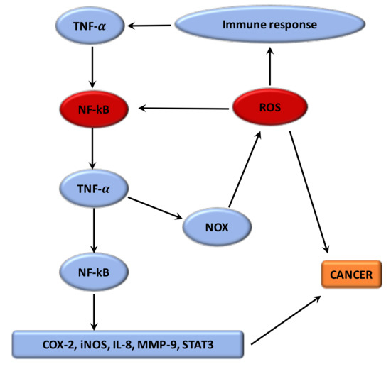 Chronic inflammation is also responsible for an augmentation in cyclooxygenase 2 (COX-2, a prostaglandin-endoperoxidase synthase) [95]. Several cytokines (TNF-α, IL-1) activate COX-2 [90]. COX-2 stimulates ROS and RNS production [95,96]. NF-κB stimulates several pro-inflammatory factors that activate COX-2 and inducible nitric oxide synthase (iNOS) [82]. NF-κB is one of the major factors implicated in chronic inflammation in the cancer process [82,97]. Numerous studies have shown that NF-κB stimulates the expression of TNF-α, IL-6, IL-8, STAT3, COX-2, BCL-2 (B-cell lymphoma 2), metalloproteinases (MMPs), VEGF [82], and thus ROS production [98]. Il-6 and VEGF stimulate the STAT-3 pathway, which is involved in proliferation, angiogenesis and metastasis [99]. Numerous cancers show an over-activation of the STAT-3 pathway [100]. Furthermore, during chronic inflammation, iNOS, an enzyme catalyzing nitric oxide (NO), is stimulated [101], resulting in an increase in p53 gene mutations [90].