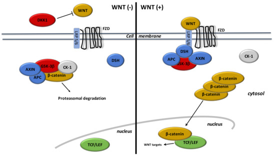 WNT ligands are lipoproteins that stimulate specific co-receptors (Figure 2). These WNT ligands stimulate the canonical WNT pathway by activation of β-catenin. WNT ligands stimulate frizzled (FZD) receptors and low-density lipoprotein receptor-related protein 5 and 6 (LRP 5/6) [129,130]. The complex formed by these extracellular WNT ligands and FZD/LRP5/6 activates the intracellular disheveled (DSH). This stimulation leads to inactivate the destruction complex of β-catenin in the cytoplasm. B-catenin accumulates in the cytoplasm and then migrates into the nucleus. Nuclear β-catenin links to T-Cell factor/lymphoid enhancer factor (TCF/LEF) to activate target gene transcriptors, such as c-Myc and cyclin D1 [131].
