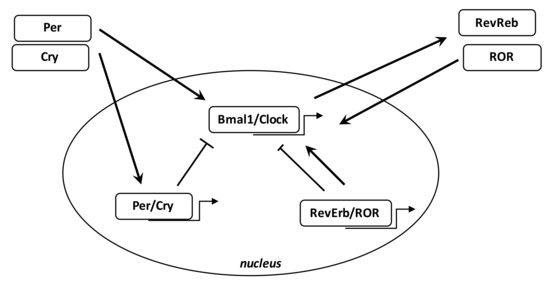 Numerous biological phenomena in the body are regulated by the circadian “clock” (circadian locomotors output cycles kaput). The circadian clock is in the hypothalamic suprachiasmatic nucleus (SCN). CRs are endogenous and entrainable free-running periods that last approximately 24 h. Numerous transcription factors can regulate CRs. These are called circadian locomotor output cycles kaput (Clock), brain and muscle aryl-hydrocarbon receptor nuclear translocator-like 1 (Bmal1), Period 1 (Per1), Period 2 (Per2), Period 3 (Per3), and Cryptochrome (Cry 1 and Cry 2) [185,186] (Figure 3). These factors are controlled by positive and negative self-regulation mediated by CRs [187,188]. Clock and Bmal1 heterodimerize and thus enhance the transcription of Per1, Per2, Cry1, and Cry2 [189]. The Per/Cry heterodimer can downregulate its stimulation through negative feedback. It migrates back to the nucleus to directly inhibit the Clock/Bmal1 complex and then repress its own transcription [189]. The Clock/Bmal1 heterodimer also stimulates the transcription of retinoic acid-related orphan nuclear receptors, Rev-Erbs, and retinoid-related orphan receptors (RORs). By a positive feedback, RORs stimulate Bmal1 transcription, while Rev-Erbs inhibit their transcription by a negative feedback [189].