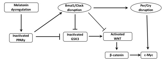 The numerous interactions between clock dysregulation and cancer underline the interest of circadian therapeutic actions [29]. The temporal peak of cell activity could be targeted by pharmacological drugs used at an optimal time of day. Few studies have shown the potential role of WNT and PPAR gamma with circadian clocks in cancer development. Nevertheless, interest in the association between PPAR gamma agonists and melatonin in cancer therapy is not new [236]. In cultured cells, the addition of melatonin with a PPAR gamma agonist (such as troglitazone) is associated with a significant reduction in cell numbers [237]. Moreover, other studies have shown a potent apoptotic effect of a combination of melatonin with PPAR gamma agonists in breast cancer cells [238,239]. In parallel, recent studies have shown that melatonin could inhibit WNT pathway expression [240,241].