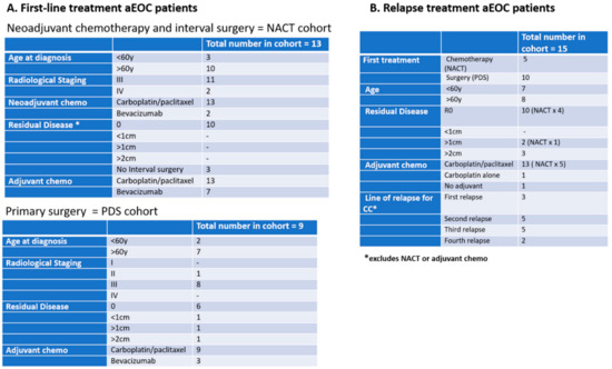 Details of patients enlisted in the study. (A) Neoadjuvant chemotherapy and interval surgery; NACT cohort (n = 13) and Primary surgery, PDS cohort (n = 9); (B) Relapse treatment aEOC patients (n = 15).