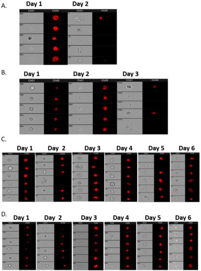 Circulating cell (CC) integrity over 6 days in EDTA tubes (A; 2 days), Streck tubes (B; 3 days), PAXgene tubes (C, 6 days) and Roche (D, 6 days) as assessed by Imagestream™. Chanel 1: brightfield, Channel 5: DRAQ5™ nuclear staining (red).
