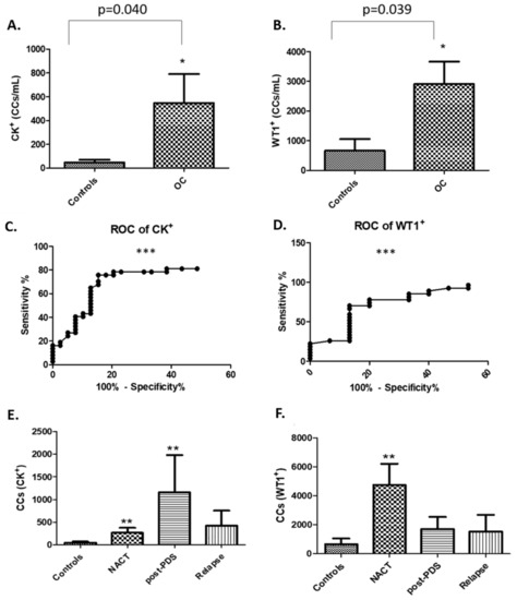 The numbers of CK+ or WT1+ cells per mL of blood from patients in each of the three groups: NACT (n = 13 for CK+ and n = 11 for WT1+) versus post-PDS (n = 9 for both CK+ and WT1+) versus Relapse (n = 15 for CK+ and n = 7 for WT1+), are depicted in Figure 4E,F and compared to healthy volunteers (n = 39 for CK+ and n = 15 for WT1+).