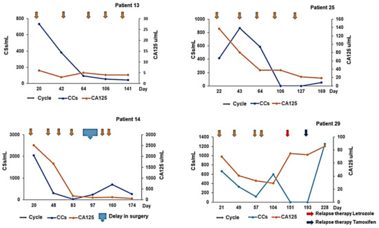Overall, CCs (WT1+/CD45−/DRAQ5™+) varied in broad alignment with serum CA125 response (Figure 5); for example, patient 14 had a similar drop in CCs and CA125 levels following the first 3 treatments. However, when we performed correlation analysis (Pearson and Spearman) no apparent significance was reached. As it can be seen, patient 13 had adjuvant chemotherapy after primary surgery for stage IIB ovarian cancer and there was a good response that correlated with a drop in CC level, although no apparent change was noted for CA125 levels. A similar pattern was evident for patient 25, who received chemotherapy for first relapse ovarian cancer with a good clinical response. Patient 14, was a NACT patient that received 4 cycles of chemotherapy, followed by an unexpected 50-day delay prior to interval surgery. It is evident that although CA125 remained stable, CCs rose in line with disease relapse/progression during this period. Patient 29 is a post-PDS (post-surgery) patient showing early relapse during adjuvant chemotherapy at 130 days, which was preceded by a rise in CC level at 60–70 days. If we had known this, we may well have withheld her chemotherapy after 2–3 cycles due to it being ineffective. CC levels decreased dramatically following treatment with letrozole and subsequent tamoxifen (relapse therapy). A one month follow up demonstrated a rapid surge of CCs concomitant with the diagnosis of brain metastases and relatively early death of this patient.