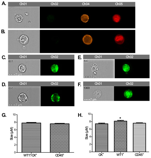 Different sizes of WBCs (A: 8µM; B: 10µM), CK+ CCs (C: 7µM, D: 8.5 µM), WT1+ CCs (E: 7µM; F: 8µM). (G): No apparent differences in size were detectable when combined CK+ and WT1+ CCs were measured and compared to controls. However, WT1+ CCs were larger compared to CK+ CCs; but not by a great margin (H; * p < 0.05).