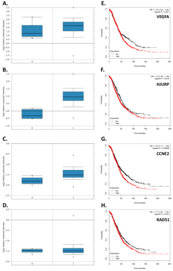 Oncomine analysis for VEGFA (A), HJURP (B), CCNE2 (C) and RAD51 (D) mRNA expression, using the Bonome ovarian dataset; Human Genome U133A Array (Normal benign controls (Lane 0) n = 10, and Ovarian Carcinoma (Lane 1) n = 185), demonstrate a significant upregulation for all four genes in the cancer cohort compared to controls: VEGFA (210512_s_at): (p = 1.24 × 10−13; fold change = 1.670), HJURP (218726_at): (p = 9.10 × 10−10; fold change = 2.347), CCNE2 (211814_s_at): (p = 5.80 × 10−6; fold change = 1.286) and RAD51 (205023_at): (p = 1.08 × 10−4; fold change = 1.475). Overall Survival (OS) plotted as a Kaplan Meier, shows poorer overall survival in the high expression group of OC patients for all 4 genes tested. More specifically: VEGFA (210512_s_at; (E): (p = 0.027, Low = 482 High = 1174), HJURP (218726_at; (F): (p = 0.015, Low = 459 High = 1197), CCNE2 (205034_at; (G): (p = 0.00046, Low = 686 High = 970), and RAD51 (205023_at; (H): (p = 0.023, Low = 554 High = 1102).