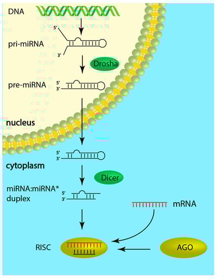 MicroRNA biogenesis. First the microRNA (miRNA) gene is transcribed to create the pri-miRNA, a single-stranded RNA hairpin with imperfect base pairing. Then, Drosha will cleave the pri-miRNA into a 70-nucleotide hairpin with a 2-nucleotide-3′ overhang, the pre-miRNA. After export to the cytoplasm, Dicer will further process the molecule and form a double-stranded miRNA:miRNA* duplex 22 nucleotides long. One strand of this duplex, called the guide strand, combines with the Argonaute (AGO) protein and the target messenger RNA into the RNA-induced silencing complex (RISC). The other strand, the passenger strand, is degraded.