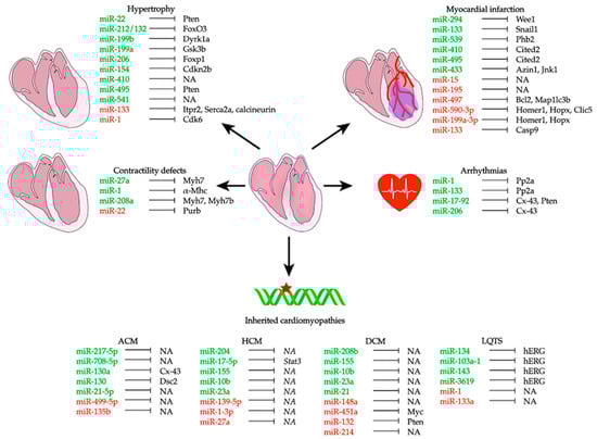 MiRNAs and the relative targets associated with cardiac diseases. Green miRNAs are upregulated, while red miRNAs are downregulated in the different diseases. NA, not available.