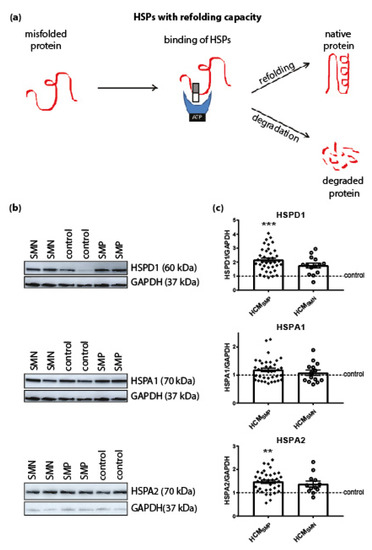 HSPs with a refolding capacity. (a) HSPs with ATPase activity and stabilizing HSPs bind to the misfolded protein to stabilize and further process it. HSPs with a refolding capacity either refold the misfolded protein to its native structure or, if refolding is impossible, the HSPs assist in the degradation pathways to degrade the misfolded protein. Figure reproduced and adapted with permission from Dorsch, L.M. et al., Pflügers Archiv—European Journal of Physiology, published by Springer Berlin Heidelberg, 2018. (b) Representative blot images for HSPD1, HSPA1, and HSPA2 expression. (c) Higher levels of HSPD1 and HSPA2 in HCMSMP (n = 38) compared to controls. HSPs with refolding capacity were unaltered in HCMSMN (HSPD1, HSPA1: n = 14; HSPA2: n = 12) compared to controls. There were no significant differences between HCMSMP and HCMSMN. Each dot in the scatter plots represents an individual sample. ** p < 0.01 and *** p < 0.001 versus controls.
