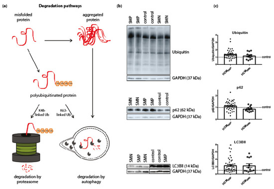 Degradation pathways. (a) Misfolded proteins with polyubiquitin chains linked via lysine 48 (K48) are mainly degraded by the proteasome. Misfolded proteins carrying K63-linked polyubiquitin chains and aggregated proteins enter the autophagic pathway. Figure reproduced and adapted with permission from Dorsch, L.M. et al., Pflügers Archiv—European Journal of Physiology; published by Springer Berlin Heidelberg, 2018. (b) Representative blot images for ubiquitin, p62, and LC3BII expression. (c) Protein levels of ubiquitin and p62 did not differ between HCM and controls samples. Higher levels of LC3BII in HCMSMP (n = 38) compared to controls. There were no significant differences between HCMSMP and HCMSMN (ubiquitin, p62: n = 12; LC3BII: n = 13). Each dot in the scatter plots represents an individual sample. * p < 0.05 versus controls.
